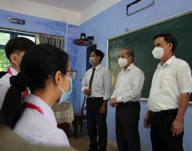 Phó Bí thư Thường trực Tỉnh uỷ Phan Ngọc Thọ bày tỏ vui mừng khi cơ sở trường lớp của Trường THCS Phú Bài ngày càng khang trang, sạch đẹp. Tuy nhiên, trường cần tăng cường giáo dục các em học sinh nâng cao ý thức phòng, chống dịch để có một năm học mới đạt kết quả tốt. Phó Bí thư Phan Ngọc Thọ đã ân cần thăm hỏi việc học tập của các em học sinh lớp 9 của trường.
