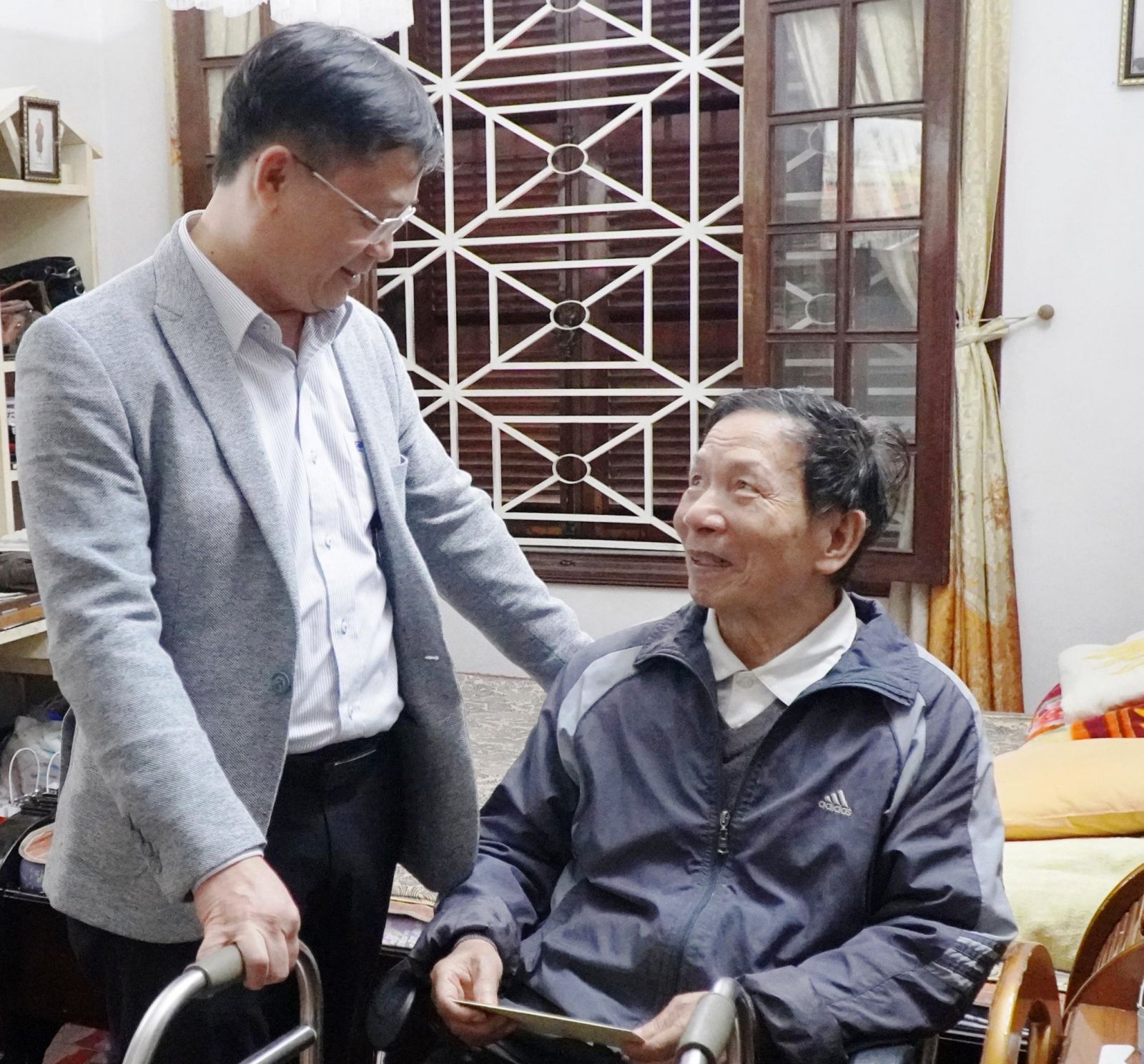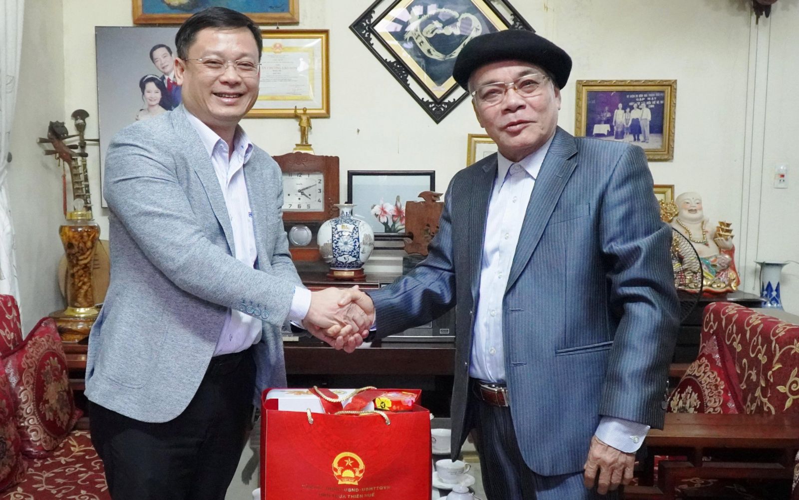 Phó Chủ tịch Thường trực UBND tỉnh Nguyễn Thanh Bình chúc mừng năm mới ông Ngô Hòa, nguyên UVTV Tỉnh ủy, Phó Chủ tịch Thường trực UBND tỉnh