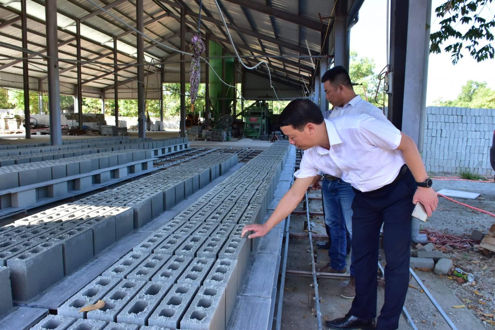 Phó Chủ tịch UBND tỉnh Phan Thiên Định đánh giá cao mô hình tận thu cát sỏi từ "rác thải" xây dựng cho ra sản phẩm thân thiện môi trường là gạch block không nung