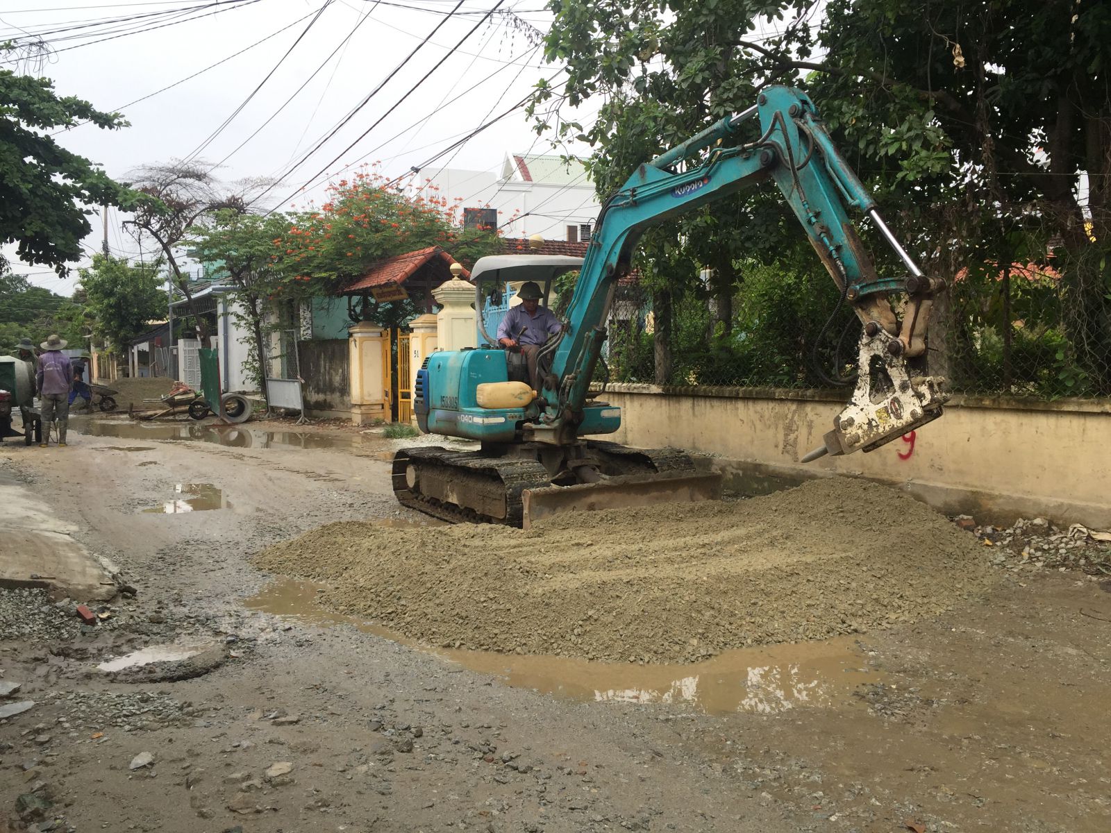 Đơn vị thi công đổ đất đá để lấp vũng nước đọng ở đường Dương Văn An trong sáng 14/9. Ảnh: Tâm Huệ