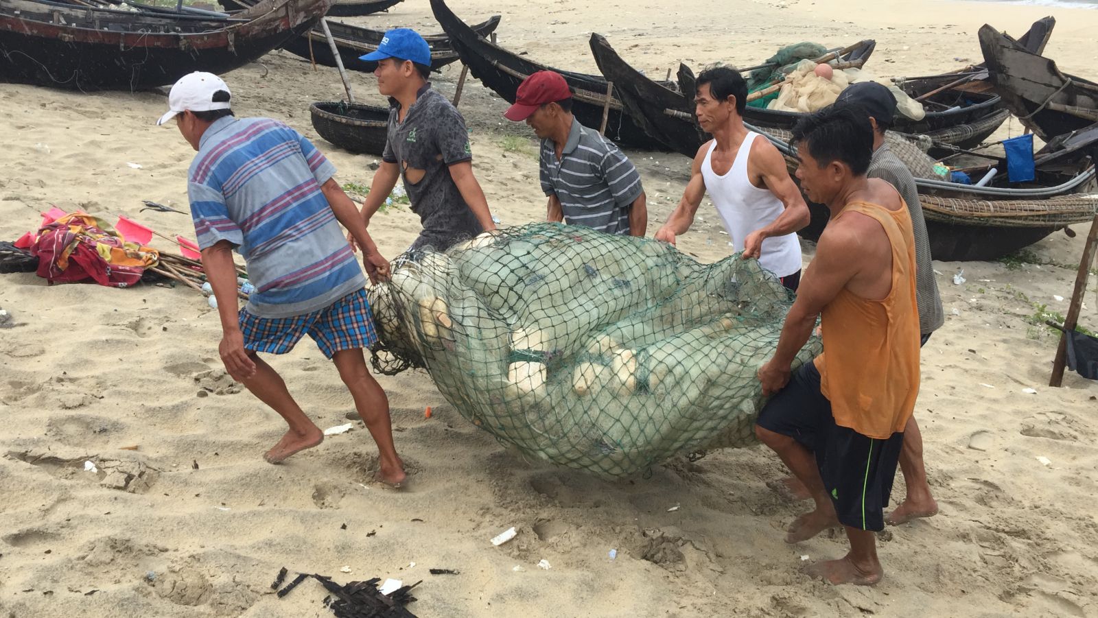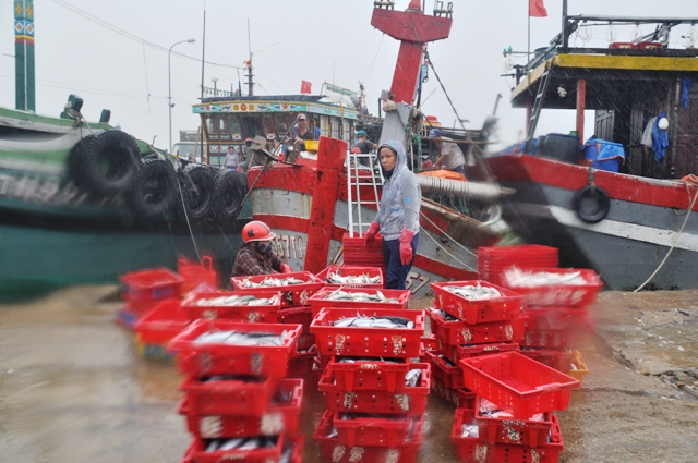 Ngư dân hối hả vận chuyển cá tại cảng Thuận An