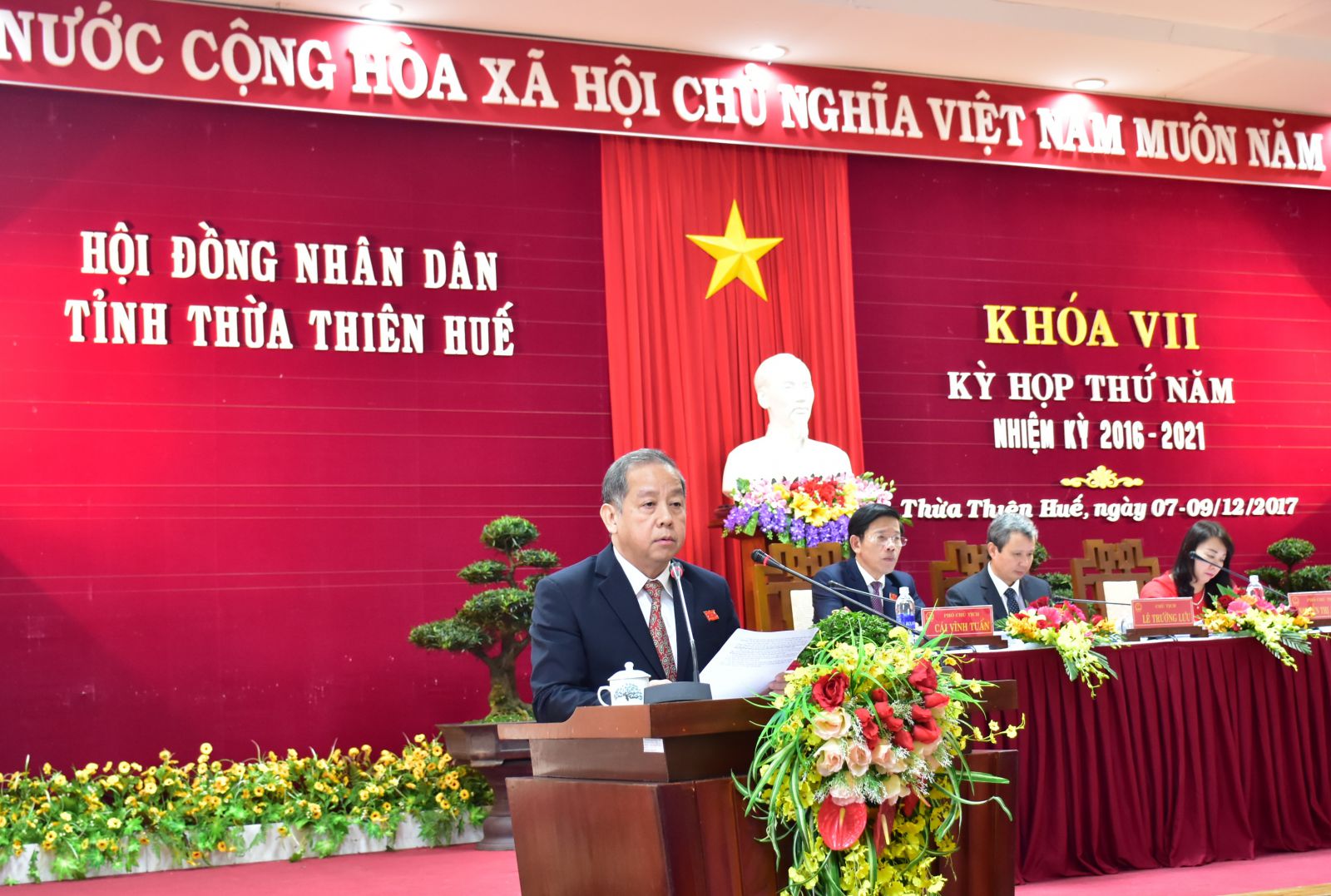 Phó Chủ tịch Thường trực UBND tỉnh Phan Ngọc Thọ trình bày báo cáo về phòng chống tham nhũng, lãng phí, gian lận thương mại tại HĐND tỉnh sáng 7/12