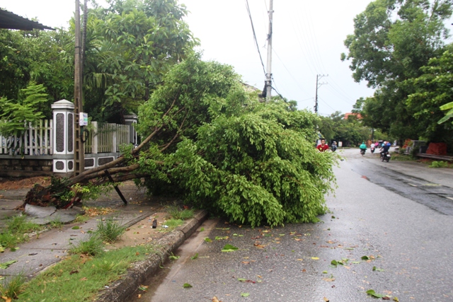 HNN.VN - Trận mưa kèm theo gió lớn khiến một số cây xanh, trụ điện trên quốc lộ 49 đoạn đi qua xã Phú Dương, huyện Phú Vang bị gãy đổ.