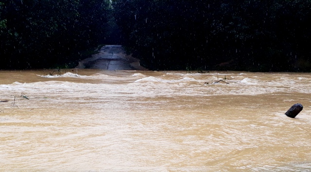 Cầu ngầm ông Đủ đang ngập sâu từ 1,8-2m, và dự báo nước có thể dâng cao nếu mưa to kéo dài