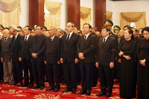 Đoàn đại biểu Thành ủy, HĐND, UBND, Ủy ban MTTQ TP HCM cùng các nguyên lãnh đạo Đảng, Nhà nước nghỉ hưu tại TP HCM và thành viên Ban Tổ chức Lễ tang do ông Nguyễn Thiện Nhân - Ủy viên Bộ Chính trị, Bí thư Thành ủy TP HCM - dẫn đầu đã vào viếng Đại tướng Lê Đức Anh, nguyên Chủ tịch nước.