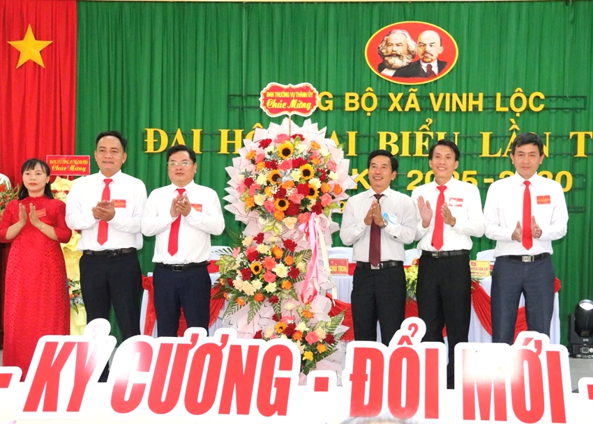 | UVTV, Trưởng ban Nội chính Thành ủy Đặng Ngọc Trân (thứ 3, từ phải sang) tặng hoa chúc mừng Đại hội Đại biểu Đảng bộ xã Vinh Lộc (Ảnh: Hữu Phúc) |