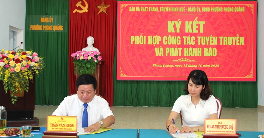 | Phó Tổng biên tập Báo và Phát thanh, Truyền hình Huế - Hoàng Thị Phương Huệ và Phó Bí thư Thường trực Đảng ủy phường Phong Quảng - Trần Văn Hùng ký kết biên bản ghi nhớ phối hợp công tác tuyên truyền |