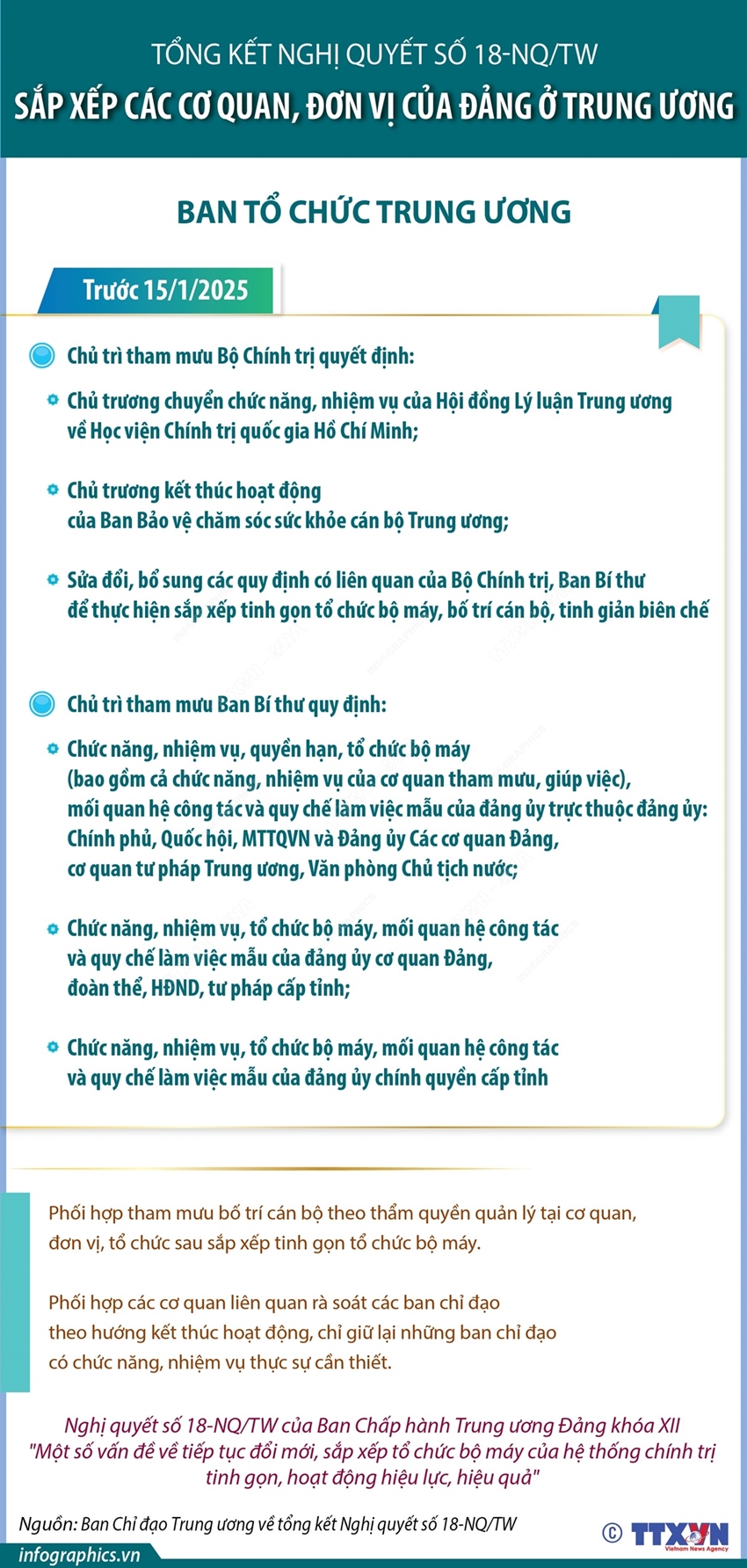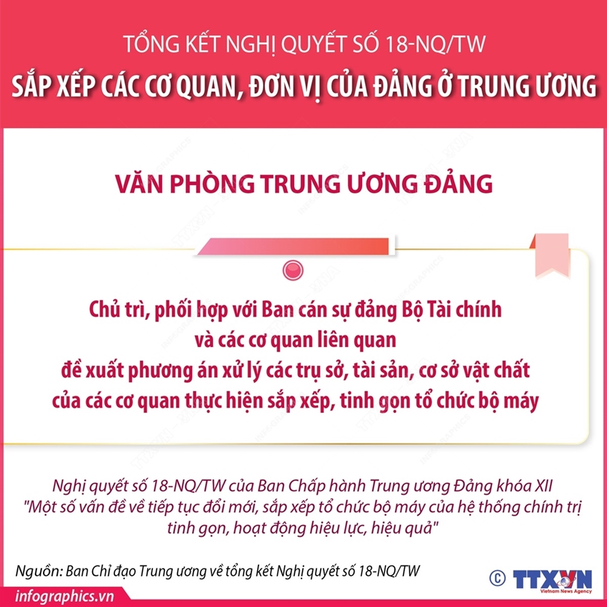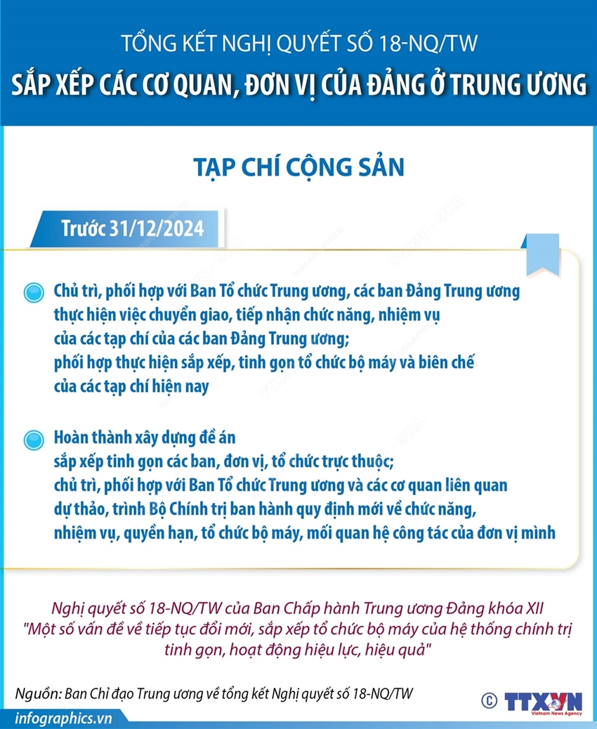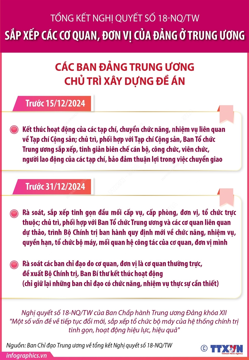 Tại Công văn số 21-CV/BCĐ ngày 5/12/2024, Ban Chỉ đạo Trung ương về tổng kết Nghị quyết số 18-NQ/TW yêu cầu các ban Đảng Trung ương chủ trì xây dựng đề án: Rà soát, sắp xếp tinh gọn đầu mối cấp vụ, cấp phòng, đơn vị, tổ chức trực thuộc; chủ trì, phối hợp với Ban Tổ chức Trung ương và các cơ quan liên quan dự thảo, trình Bộ Chính trị ban hành quy định mới về chức năng, nhiệm vụ, quyền hạn, tổ chức bộ máy, mối quan hệ công tác của cơ quan, đơn vị mình (hoàn thành trước ngày 31/12/2024); Rà soát các ban chỉ đạo do cơ quan, đơn vị là cơ quan thường trực, đề xuất Bộ Chính trị, Ban Bí thư kết thúc hoạt động (chỉ giữ lại những ban chỉ đạo có chức năng, nhiệm vụ thực sự cần thiết) (hoàn thành trước ngày 31/12/2024)…