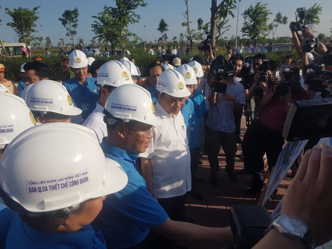 Thủ tướng Nguyễn Xuân Phúc kiểm tra việc thực hiện đề án thiết chế công đoàn tại khu công nghiệp Đồng Văn, tỉnh Hà Nam. ẢNH VĂN ĐÔNG