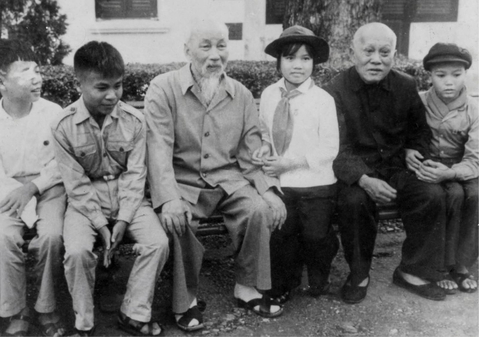Bác Hồ và Bác Tôn chụp ảnh lưu niệm với các dũng sĩ. (Trong ảnh, dũng sĩ Nguyễn Văn Hòa, người Thừa Thiên Huế ở ngoài cùng bên phải). Ảnh: TL