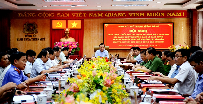 UVTW Đảng, Bí thư Tỉnh ủy, Chủ tịch HĐND tỉnh, Trưởng đoàn ĐBQH tỉnh Lê Trường Lưu; Phó Bí thư Thường trực Tỉnh ủy Phan Ngọc Thọ; Phó chủ tịch UBND tỉnh, Trưởng Ban ATGT tỉnh Hoàng Hải Minh tham dự tại điểm cầu Công an tỉnh Thừa Thiên Huế.