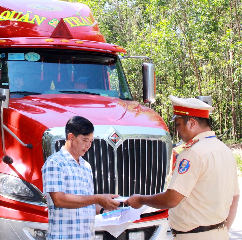 | Lực lượng CSGT Công an tỉnh kiểm tra phương tiện lưu thông trên đường tránh Huế |