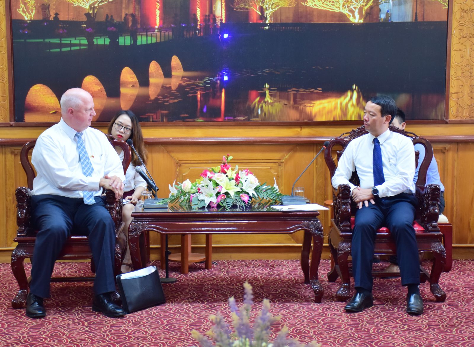 Phó Chủ tịch UBND tỉnh Phan Thiên Định (bên phải) trao đổi với Phó Chủ tịch Tập đoàn Hanesbrands