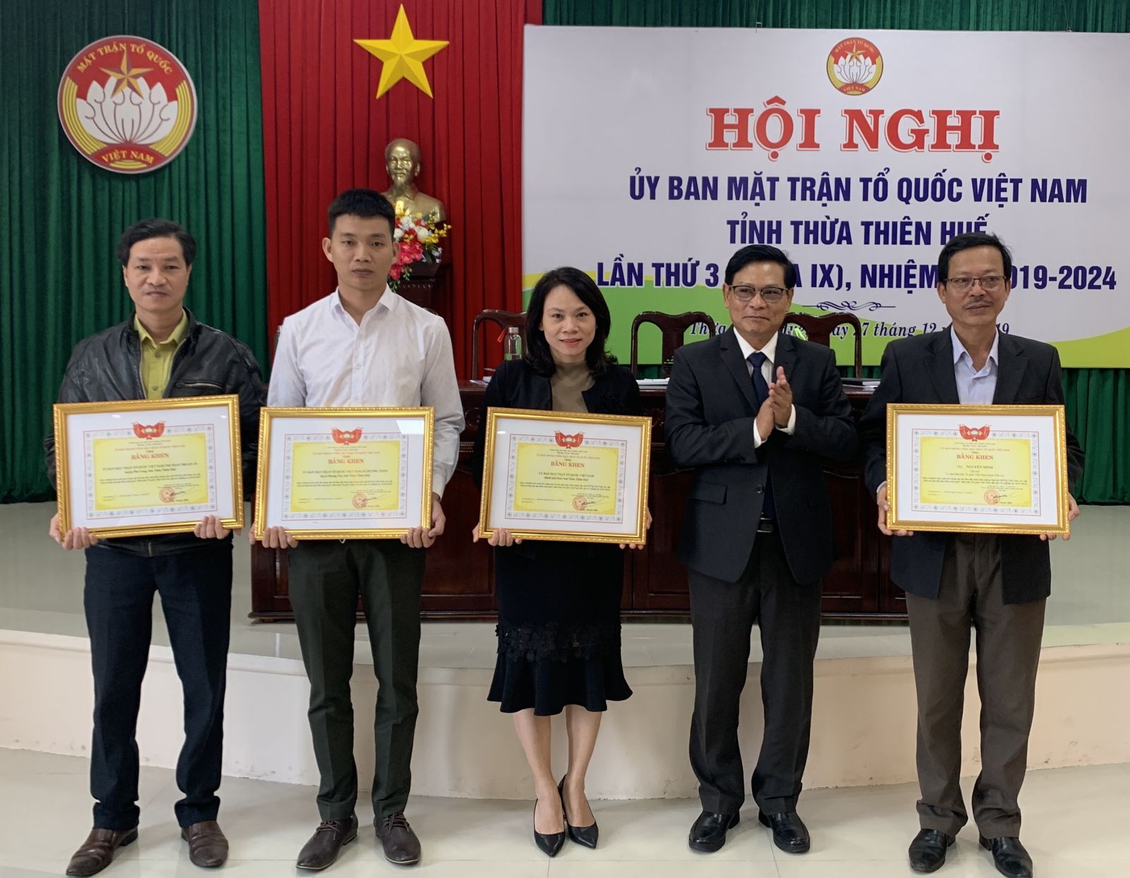 Ông Nguyễn Nam Tiến (thứ 2, từ phải sang) trao Bằng khen của Trung ương MTTQVN cho các tập thể và cá nhân đạt thành tích xuất sắc