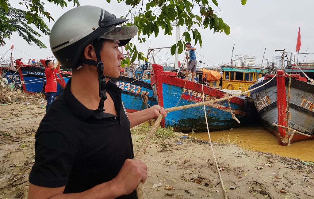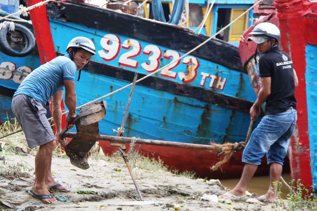 Sau khi tìm được vị trí neo đậu, các chủ tàu cùng ngư dân buộc dây vào các gốc cây lớn với khoảng cách hợp lý, hạn chế rủi ro cho tàu khi bão đổ bộ đất liền.