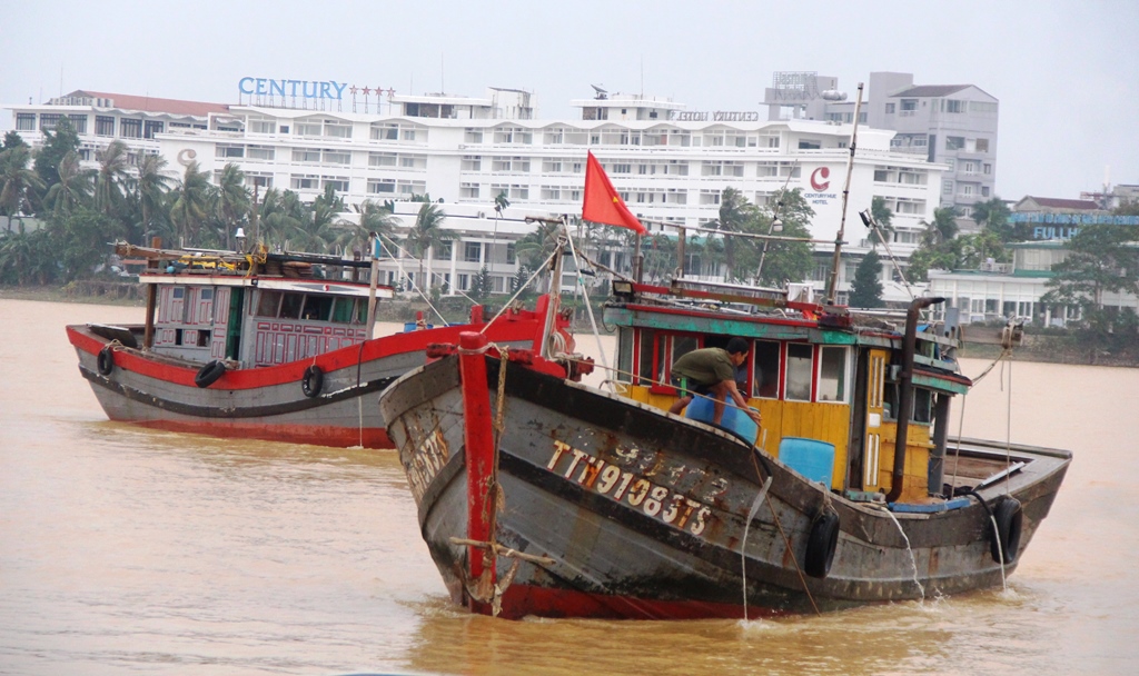 Từng chiếc thuyền theo sông Hương nối đuôi nhau chạy vào trung tâm TP. Huế khiến nhiều người tỏ ra bất ngờ vì hiếm khi thấy tàu cá lớn như thế chạy vào TP. Ở khu vực này, lực lượng cảnh sát giao thông đường thuỷ cũng có mặt hướng dẫn ngư dân đậu tàu sao cho hợp lý trước khi bão số 9 đổ bộ.