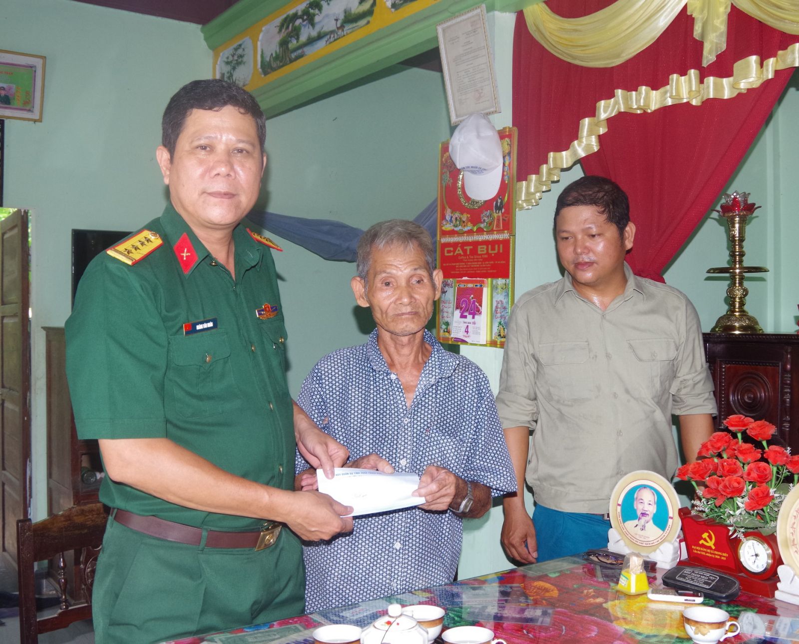 Đại tá Hoàng Văn Nhân, Chính ủy Bộ CHQS tỉnh tặng quà cho thương binh Trần Sĩ Tùng tại xã Phong Hiền, huyện Phong Điền