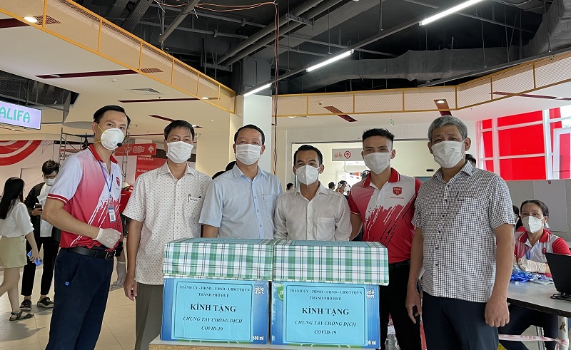 HNN.VN - UVTV Tỉnh uỷ, Bí thư Thành uỷ, Chủ tịch HĐND TP. Huế Phan Thiên Định và Phó Bí thư Thường trực Thành uỷ Trần Hùng Nam thăm và động viên thành viên Đội Phản ứng nhanh PUN75 cấp mã QR in trên thẻ nhựa cho bà con đi mua sắm tại Siêu thị GO (Siêu thị Big C cũ ở đường Bà Triệu, TP. Huế).