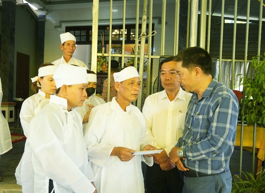 | Lãnh đạo Ủy ban MTTQVN tỉnh động viên, trao tiền hỗ trợ cho thân nhân của hai nạn nhân |