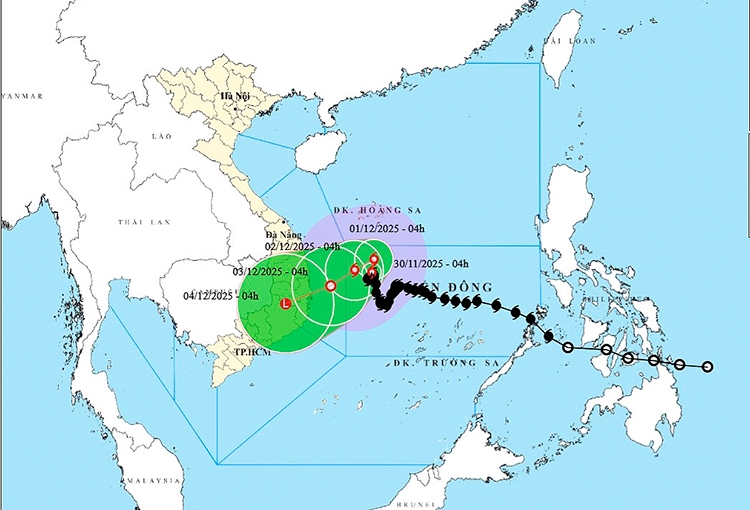 Dự báo đến 4 giờ ngày 1/12, bão sẽ ở vào khoảng 14,4 độ Vĩ Bắc; 112,3 độ Kinh Đông, cách bờ biển phía Đông tỉnh Gia Lai – Đắk Lắk khoảng 340 km. Cường độ bão không thay đổi, sức gió mạnh nhất duy trì cấp 9, giật cấp 11; hướng di chuyển chuyển sang Bắc với tốc độ khoảng 3 km/giờ.
