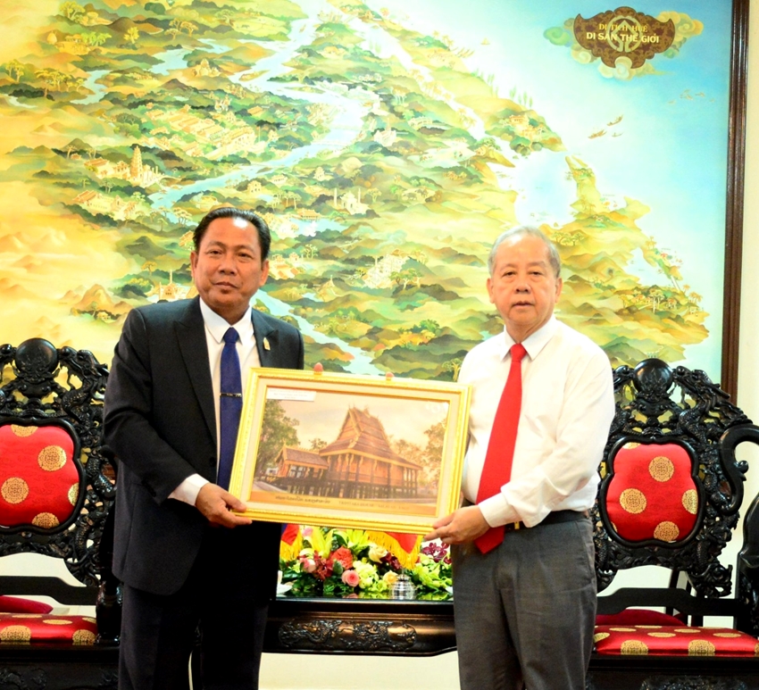 | Trưởng ban Tuyên huấn Tỉnh ủy Salavan Chăn Sa Mỏn – Phôm Ma Sẻng tặng quà lưu niệm đến Phó Bí thư Thường trực Tỉnh ủy Phan Ngọc Thọ |