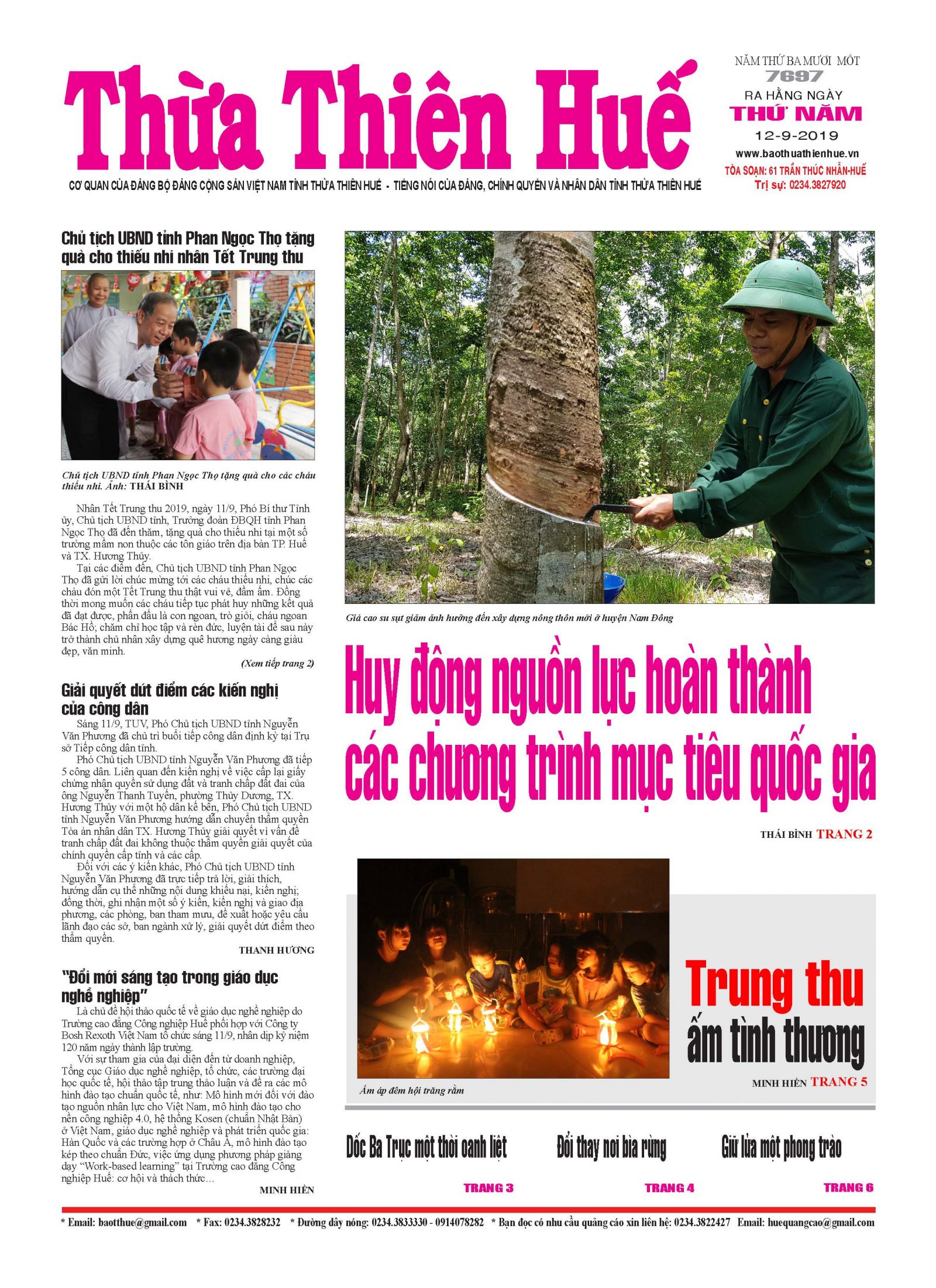 Trang nhất Báo Thừa Thiên Huế số 7697 ra thứ năm ngày 12/9/2019