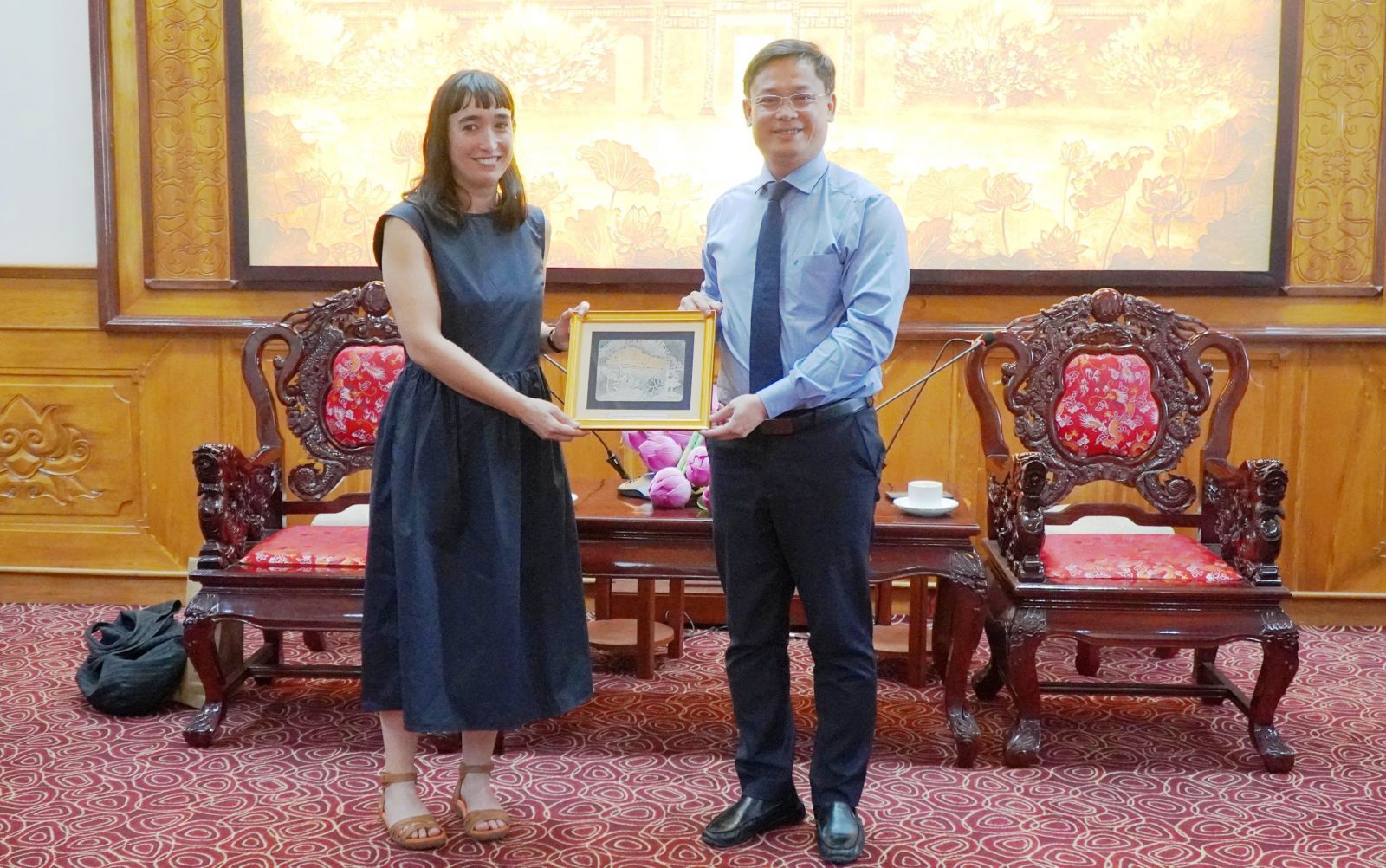 Phó Chủ tịch Thường trực UBND tỉnh Nguyễn Thanh Bình tặng quà lưu niệm cho bà SCARWELL Dorothée