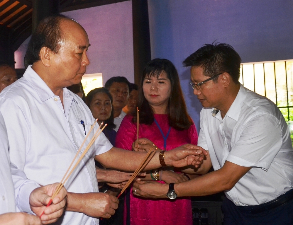 Thủ tướng Chính phủ Nguyễn Xuân Phúc và Phó Bí thư Thường trực Tỉnh ủy Bùi Thanh Hà cùng đoàn đến thăm Di tích Nhà lưu niệm Chủ tịch Hồ Chí Minh. Ảnh: Võ Nhân