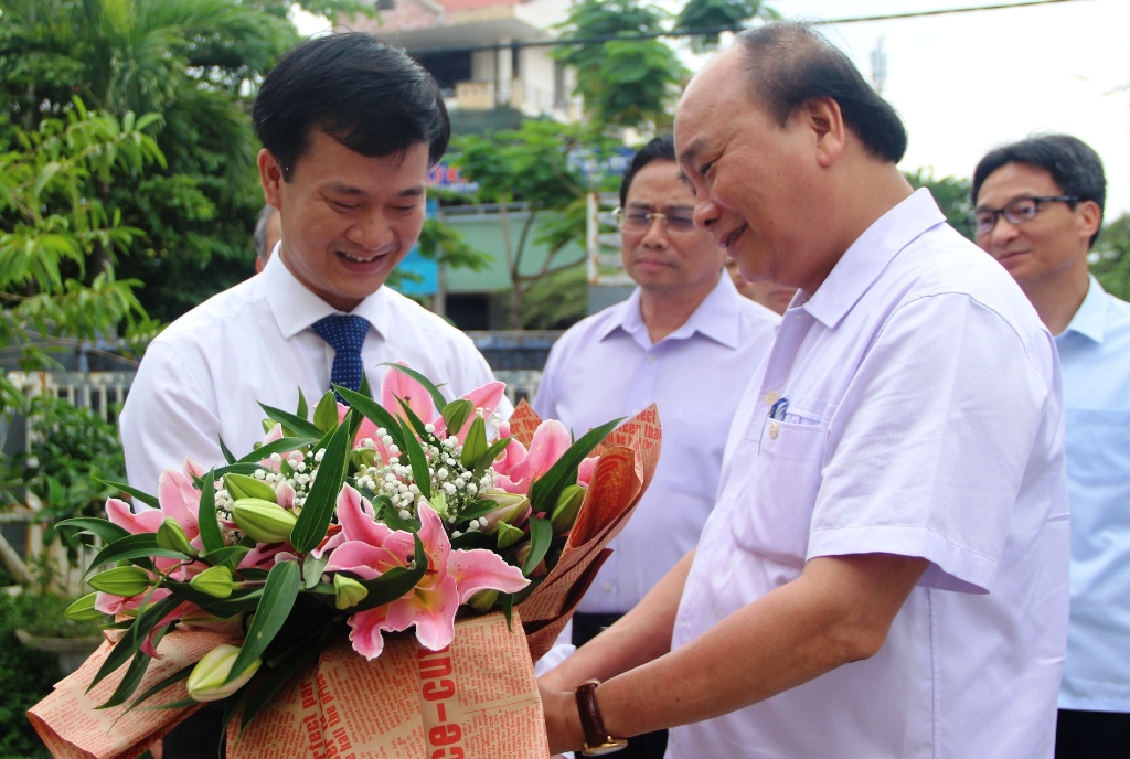 Giám đốc Sở Thông tin & Truyền thông Nguyễn Xuân Sơn tặng hoa chúc mừng Thủ tướng Nguyễn Xuân Phúc khi đến thăm Trung tâm Giám sát, điều hành đô thị thông minh. Ảnh: Lê Thọ