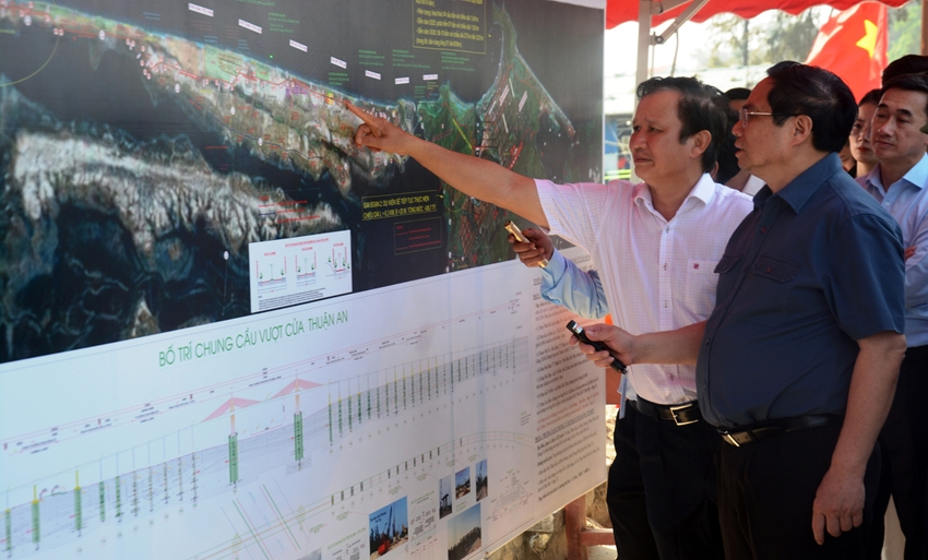 | Chiều cùng ngày, Thủ tướng Chính phủ cùng đoàn công tác kiểm tra dự án xây dựng cầu bắc qua cửa biển Thuận An, TP. Huế. Đây là cây cầu vượt cửa biển dài nhất miền Trung được khởi công từ tháng 3/2022 với tổng vốn đầu tư hơn 2.400 tỉ đồng, dự kiến hoàn thành vào năm 2025 |