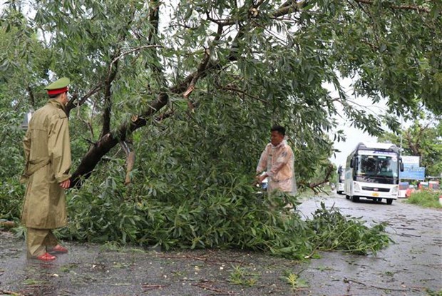Lực lượng cảnh sát giao thông Công an huyện Bình Sơn, Quảng Ngãi cắt, thu dọn cây xanh bị ngã đổ đảm bảo an toàn cho người dân lưu thông. (Ảnh: Phạm Cường/TTXVN)