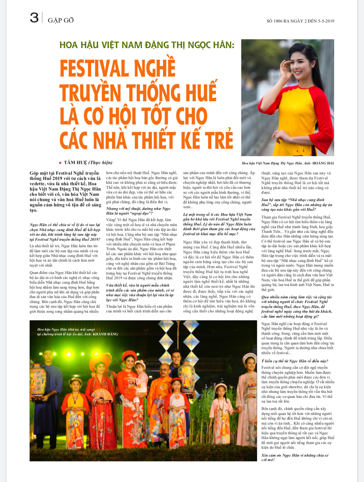 “Ngọc Hân yêu vẻ đẹp thanh bình, thơ mộng của Huế. Càng đến Huế nhiều lần, Ngọc Hân càng hiểu thêm văn hoá Huế và đây là cơ hội tốt để Ngọc Hân có thêm nguồn cảm hứng sáng tạo cho các bộ sưu tập của mình. Hơn nữa, Festival Nghề truyền thống Huế hội tụ tinh hoa nghề Việt, đây cũng là cơ hội lớn cho những người làm nghề thiết kế, nhất là những nhà thiết kế còn non trẻ như Ngọc Hân thì được đi, được thấy, tiếp xúc với các nghệ nhân, các làng nghề, Ngọc Hân càng có thêm cơ hội để tìm hiểu văn hoá, đó không chỉ là kinh nghiệm, trải nghiệm mà là vốn sống cần thiết cho những hoạt động nghệ thuật, sáng tạo của Hân sau này và Ngọc Hân nghĩ, được tham dự Festival Nghề truyền thống Huế là cơ hội tốt mà không phải nhà thiết kế trẻ nào cũng có được.