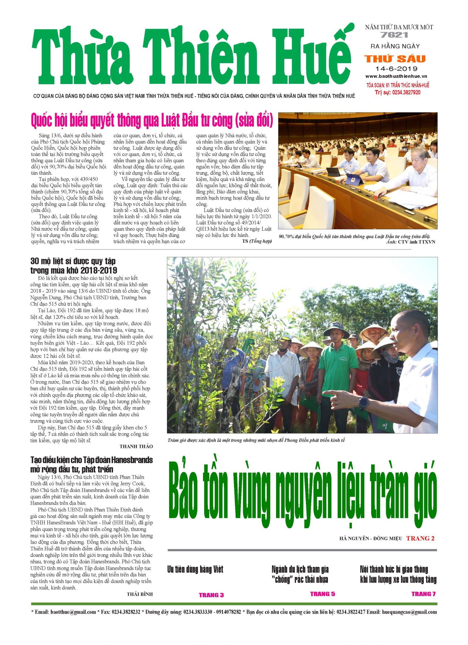 Thừa Thiên Huế số 7621, phát hành thứ sáu, ngày 14/6/12019 sẽ còn có nhiều tin, bài thời sự đáng chú ý khác.