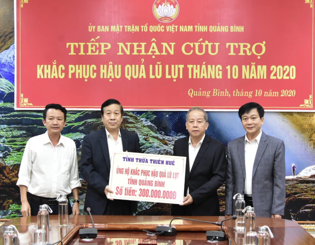 Chủ tịch UBND tỉnh Phan Ngọc Thọ (thứ hai, phải sang) trao số tiền 300 triệu đồng hỗ trợ tỉnh Quảng Bình