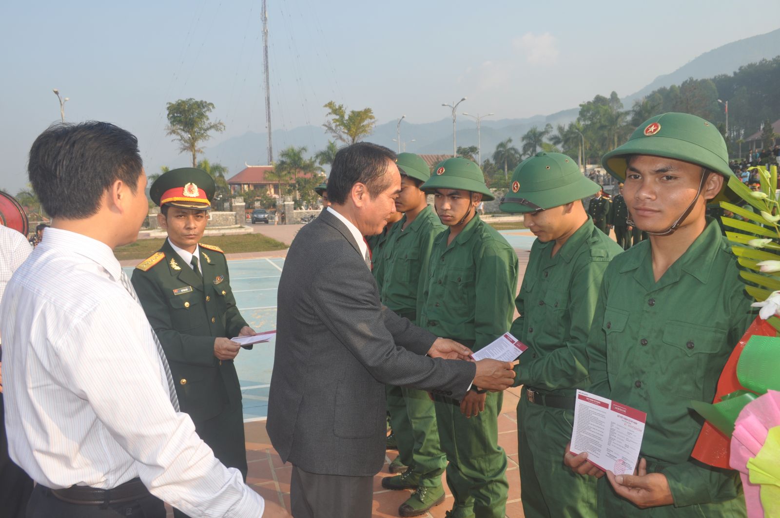 Ông Nguyễn Thái Sơn, UVTV Tỉnh ủy, Trưởng Ban Tuyên giáo Tỉnh ủy tặng quà cho các tân binh. Ảnh: Đức Quang