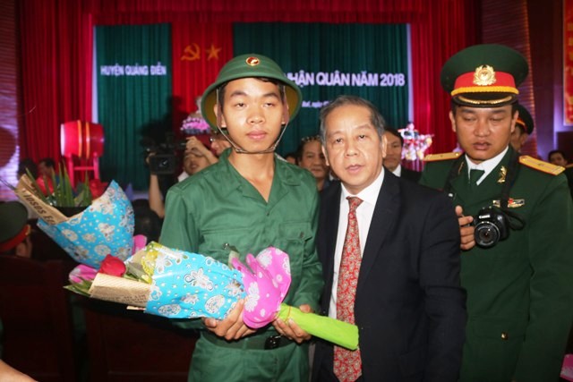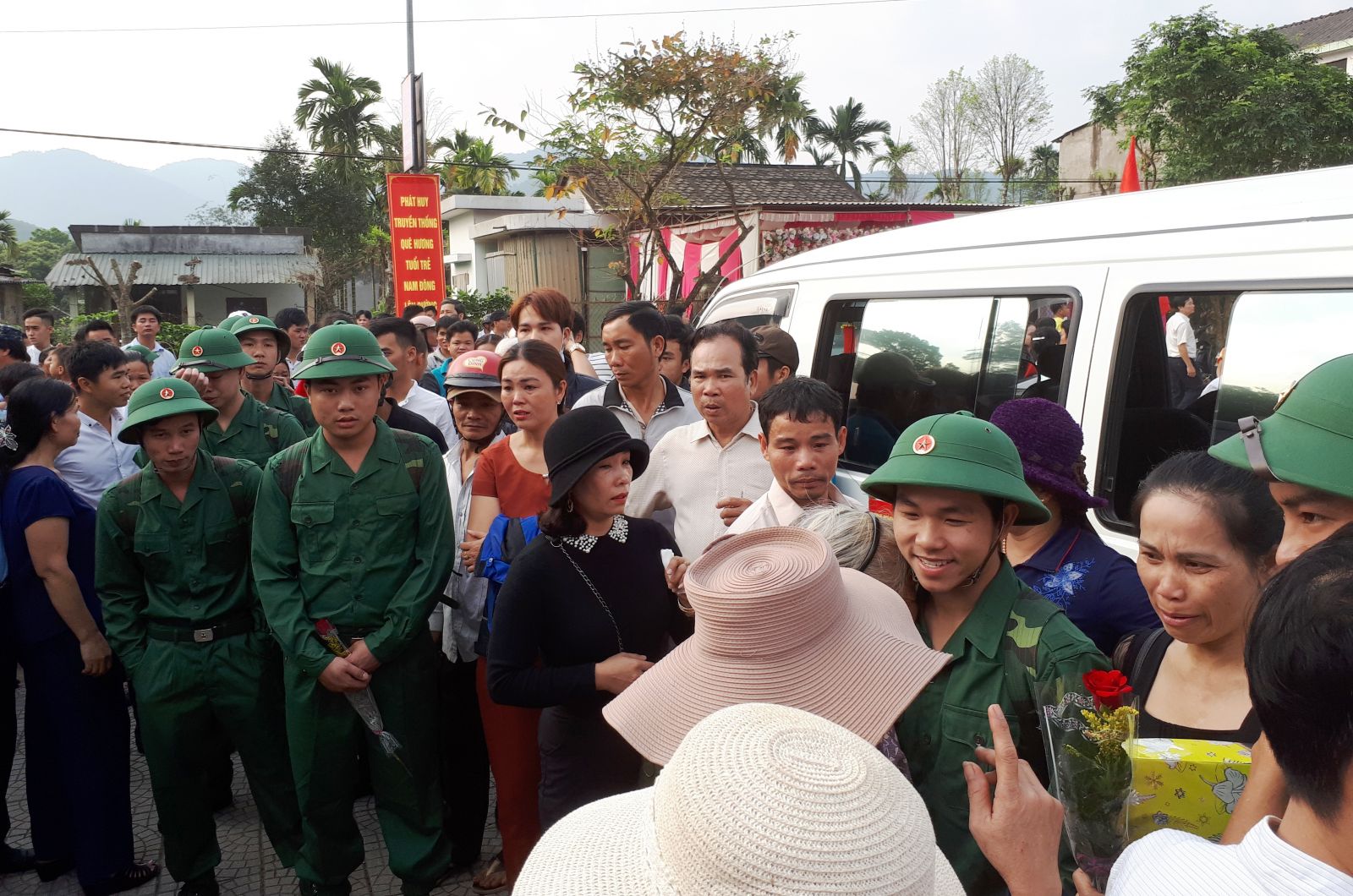 Từ sáng sớm, tại Quảng Điền các chiến sĩ cùng người nhà lần lượt tập trung về nhà văn hóa huyện, nơi diễn ra lễ giao nhận quân. Phó Chủ tịch Thường trực UBND tỉnh Phan Ngọc Thọ đã đến dự, tặng hoa và động viên các thanh niên lên đường nhập ngũ.