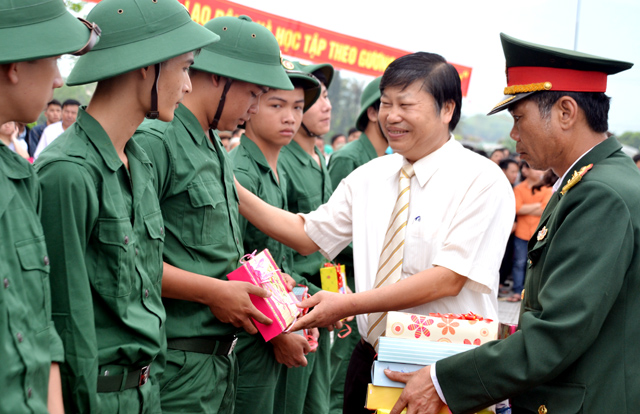 Lãnh đạo tỉnh, địa phương tặng quà chúc mừng các thanh niên lên đường nhập ngũ Ảnh: Tiến Dũng