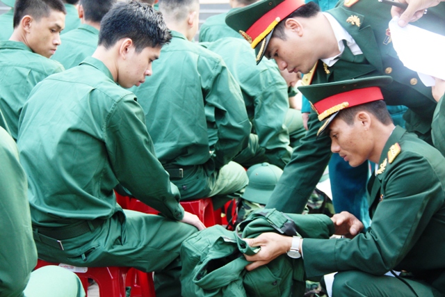 Các tân binh kiểm tra quân trang trong ngày nhập ngũ. Ảnh: Đồng Văn