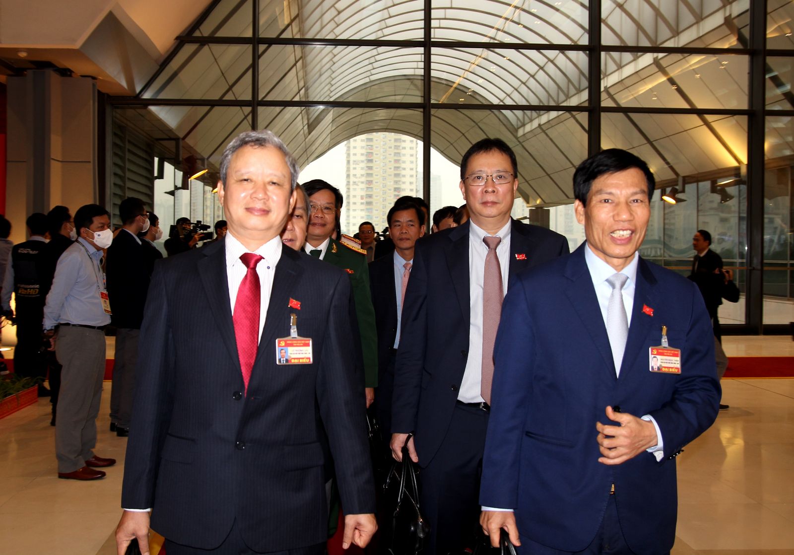 Bí thư Tỉnh ủy Lê Trường Lưu (bên trái) cùng Đoàn Đại biểu của Đảng bộ tỉnh vào hội trường tham dự Đại hội