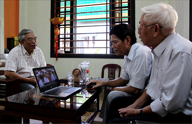 Ông Lê Đức Tính (ngồi ở giữa) cùng các cán bộ hưu trí xem lại buổi thảo luận của các đại biểu sáng 8/5 tại Hội nghị Trung ương 7 (khóa XII)