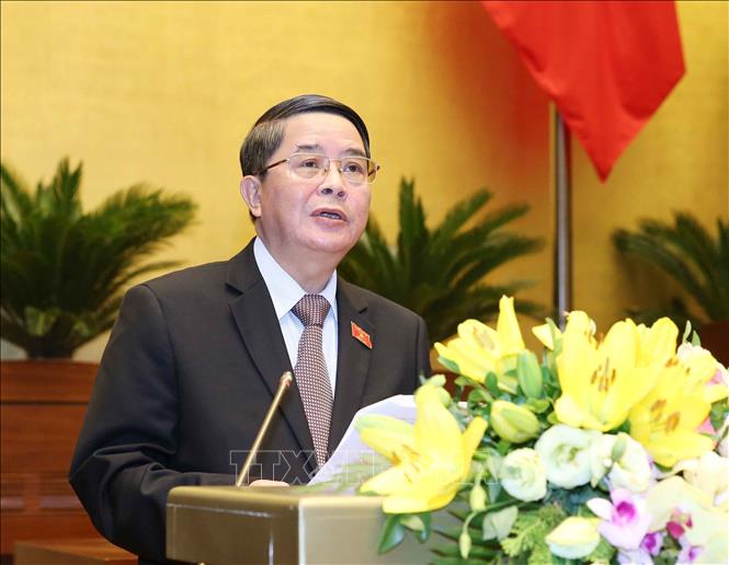 Chủ nhiệm Ủy ban Tài chính, Ngân sách của Quốc hội Nguyễn Đức Hải trình bày Báo cáo thẩm tra dự thảo Nghị quyết về khoanh tiền nợ thuế, xóa tiền phạt chậm nộp, tiền chậm nộp đối với người nộp thuế không còn khả năng nộp ngân sách nhà nước. Ảnh: Phương Hoa/TTXVN