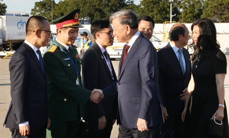 | Các đại biểu đón Tổng Bí thư, Chủ tịch nước Tô Lâm và Phu nhân cùng đoàn đại biểu cấp cao Việt Nam tại Sân bay quốc tế J.F Kennedy. (Ảnh: Lâm Khánh/TTXVN) |