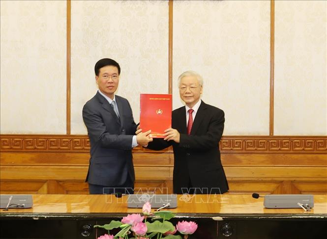 Tổng Bí thư, Chủ tịch nước Nguyễn Phú Trọng trao Quyết định cho đồng chí Võ Văn Thưởng, Ủy viên Bộ Chính trị được phân công giữ chức Thường trực Ban Bí thư