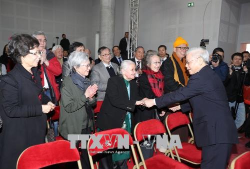 Tổng Bí thư nhấn mạnh: Cộng đồng người Việt Nam ở Pháp là một trong những cộng đồng người Việt ở nước ngoài được hình thành sớm nhất với bề dày truyền thống rất đáng tự hào. Hội người Việt Nam tại Pháp do Chủ tịch Hồ Chí Minh trực tiếp gây dựng, thành lập, trải qua 100 năm hoạt động, đã có nhiều đóng góp cho sự nghiệp đấu tranh giải phóng dân tộc với rất nhiều tấm gương tiêu biểu mà lịch sử sẽ không bao giờ quên. Ngày nay, cộng đồng người Việt Nam tại Pháp đang ngày càng lớn mạnh, có thành phần đa dạng hơn, rất nhiều người đã hội nhập thành công và có nhiều đóng góp cho cộng đồng nước sở tại. Đảng và Nhà nước vui mừng trước sự phát triển của cộng đồng người Việt Nam tại Pháp, luôn coi cộng đồng người Việt Nam ở nước ngoài nói chung và ở Pháp nói riêng là bộ phận máu thịt không tách rời của dân tộc Việt Nam; đánh giá cao những đóng góp của cộng đồng đối với sự nghiệp xây dựng đất nước cũng như những nỗ lực đoàn kết, tương trợ lẫn nhau để xây dựng cộng đồng vững mạnh, hòa nhập và đóng góp cho xã hội nước sở tại, làm cầu nối quan trọng cho quan hệ hữu nghị, hợp tác giữa Việt Nam với Pháp. Tổng Bí thư đề nghị Đại sứ quán, Bộ Ngoại giao và các cơ quan chức năng tiếp tục quan tâm, đáp ứng các nguyện vọng và nhu cầu chính đáng của bà con cộng đồng, đồng thời mong rằng Hội người Việt tại Pháp sẽ có các biện pháp đổi mới tổ chức và hoạt động để đáp ứng phù hợp với tình hình mới.