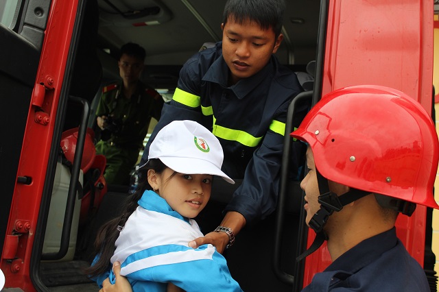 | Được lên xe để thử đi chữa cháy cùng các chiến sĩ |