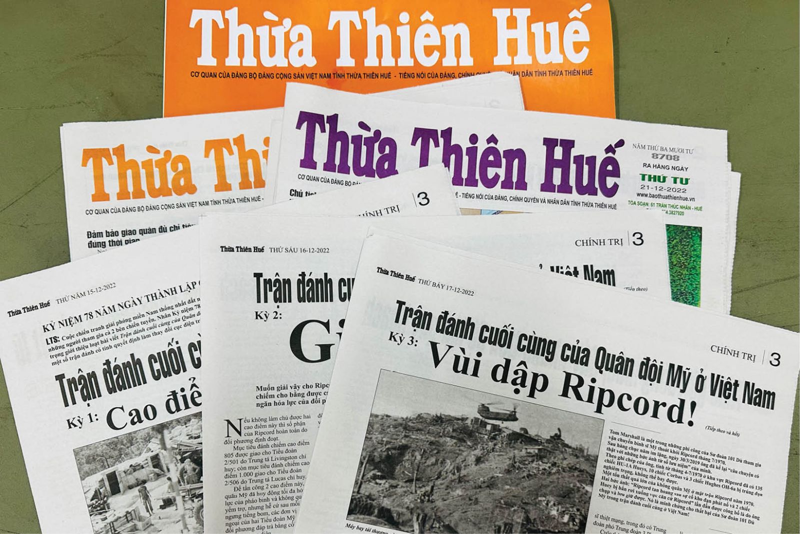 HNN - Các ngày 15, 16, 17/12/2022, bằng cả hai hình thức in và online, Báo Thừa Thiên Huế đã đăng bài nhiều kỳ về “Trận đánh cuối cùng của Quân đội Mỹ ở Việt Nam” của Nhà báo Phạm Hữu Thu. Một bài viết công phu, tâm huyết, mang cái nhìn từ cả hai chiến tuyến đã lột tả bức tranh chân thực, khách quan, toàn diện về giá trị của trận chiến ở cao điểm 935 (phía Mỹ gọi là Ripcord) do Sư đoàn 324 và Trung đoàn 6 Quân khu Trị Thiên thực hiện.