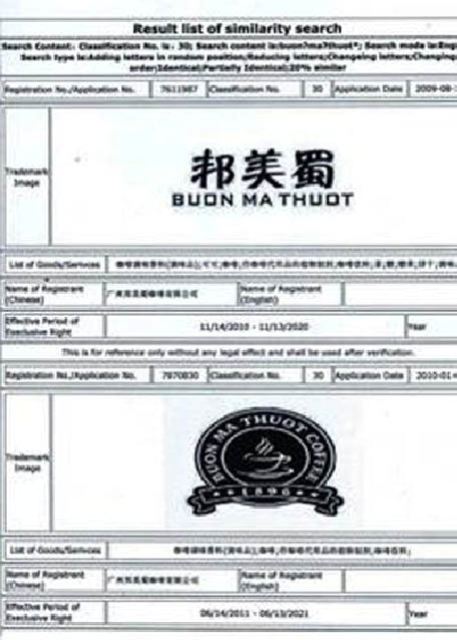Hai nhãn hiệu “BUON MA THUOT & chữ Tàu” và “BUON MA THUOT COFFEE 1896 và logo” đã được Trung Quốc cấp chứng nhận bảo hộ độc quyền cho công ty Guangzhou Buon Ma Thuot Coffee Co.,Ltd.