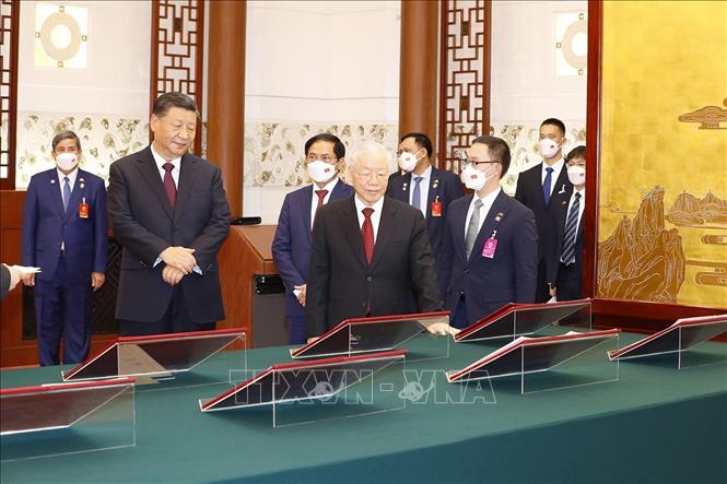 Theo đặc phái viên TTXVN, chiều 31/10, tại Đại lễ đường Nhân dân ở Thủ đô Bắc Kinh, ngay sau khi kết thúc hội đàm, Tổng Bí thư Nguyễn Phú Trọng và Tổng Bí thư, Chủ tịch Trung Quốc Tập Cận Bình đã cùng chứng kiến 13 văn kiện đã được các ban, bộ, ngành, trung ương và địa phương ký kết trong chuyến thăm chính thức lần này.