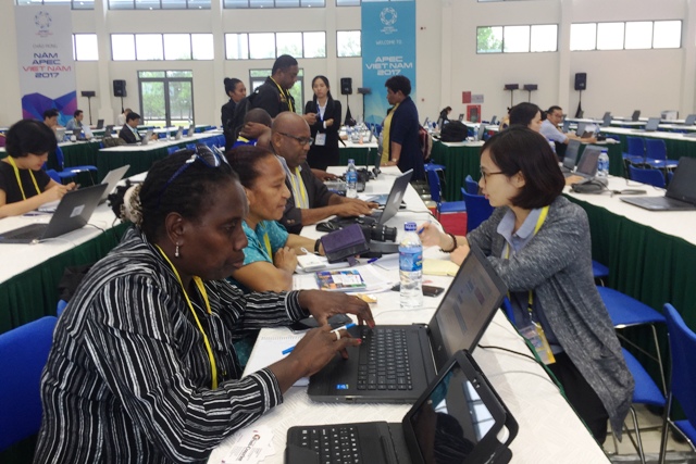 Phóng viên nước ngoài tác nghiệp tại Trung tâm báo chí APEC 2017