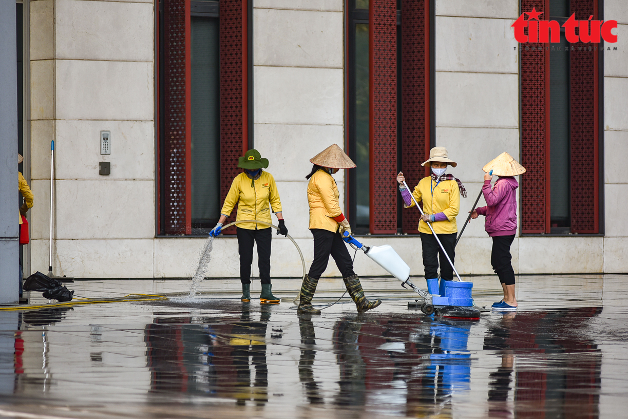 Hàng chục công nhân được huy động đảm bảo công tác vệ sinh môi trường tại Trung tâm.